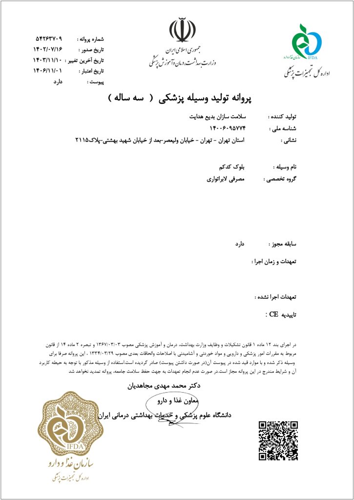 در مسیر گرفتن مجوزهای لازم ،پس از اخذ گواهی ISO13485:2016 برای گرفتن تاییدیه پروانه تولید شد ودر تاریخ 1402/07/16 موفق به اخذ گواهی تولید به شماره پروانه 54263709 از سازمان غذا و دارو گردید.