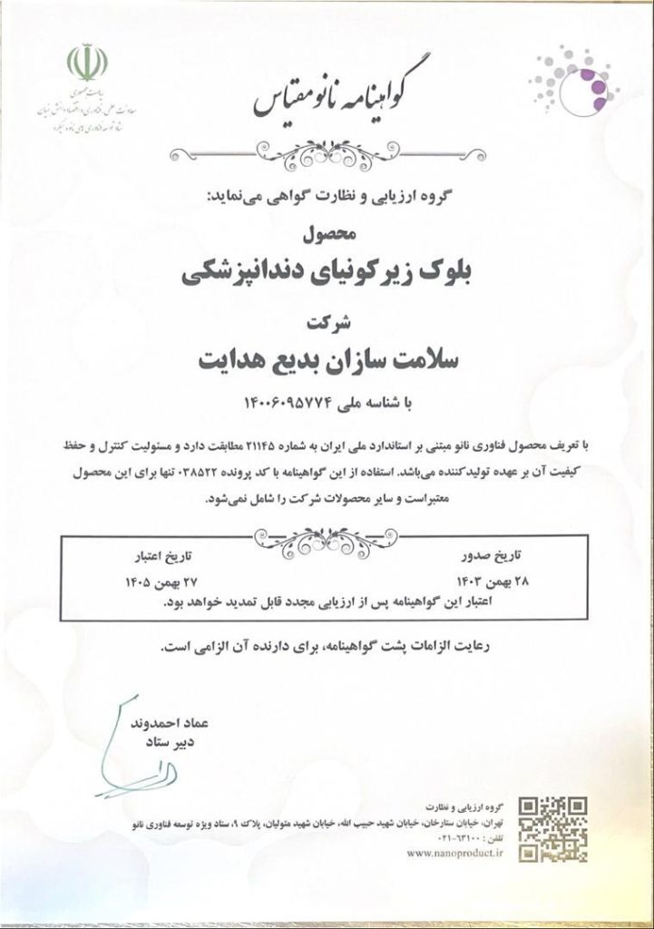 این محصول کاملاً تولید داخل بوده آزمون های مرتبط با سرامیک های دندانی یعنی ISO6872:2015 را با موفقیت و کیفیت بالا گذرانده است.